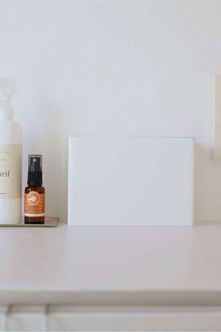 スリムなので靴箱上に置いても場所をとりません。ケースの上には少し縁が付いていて印鑑やペン、マスクスプレーなどを置いても良いですね。