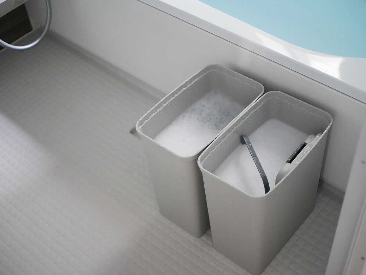 オキシクリーンでごみ箱をお掃除する場合は、お風呂場がおすすめ。お風呂ではお湯もでますし、そのままお風呂の排水口に流すこともできます。