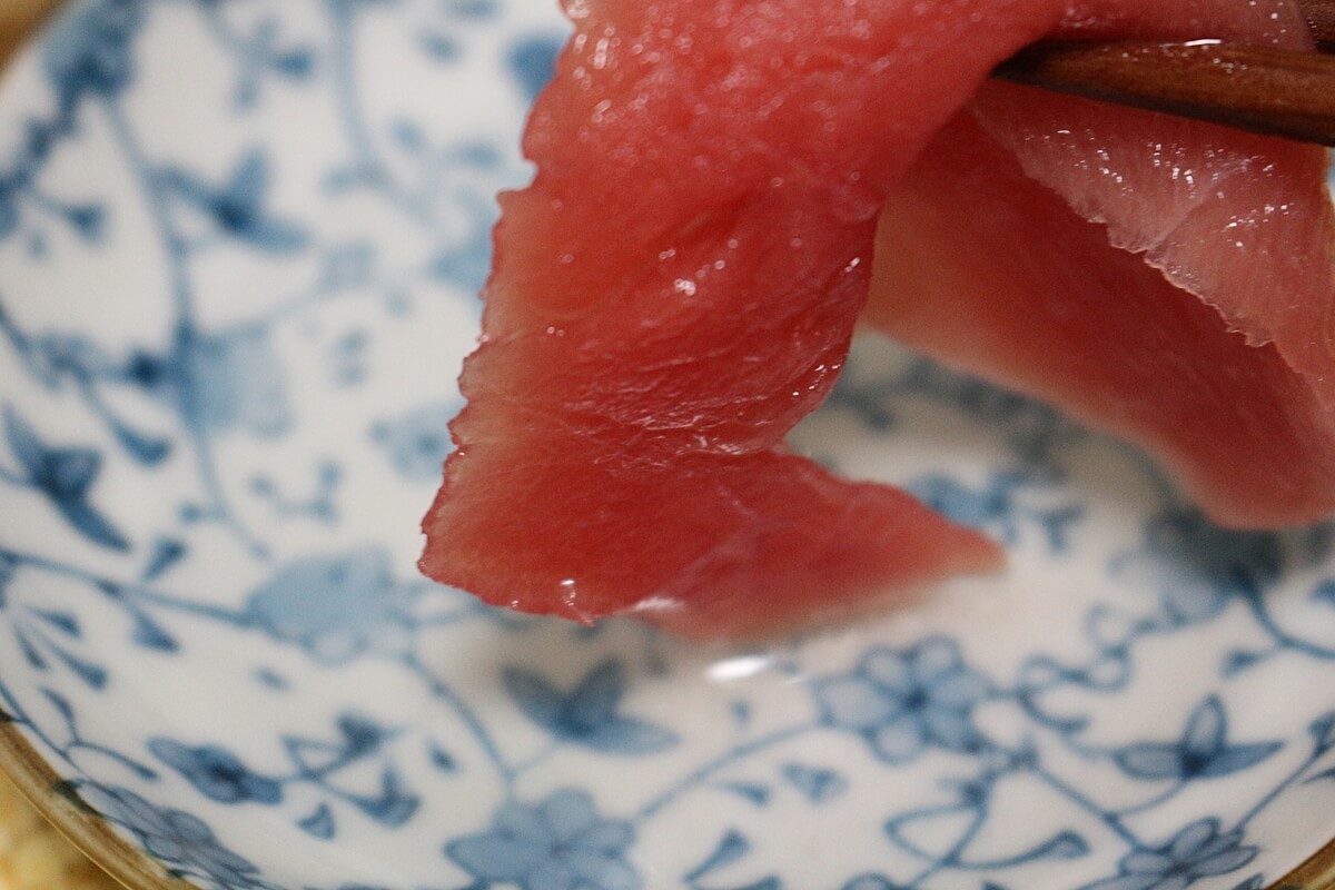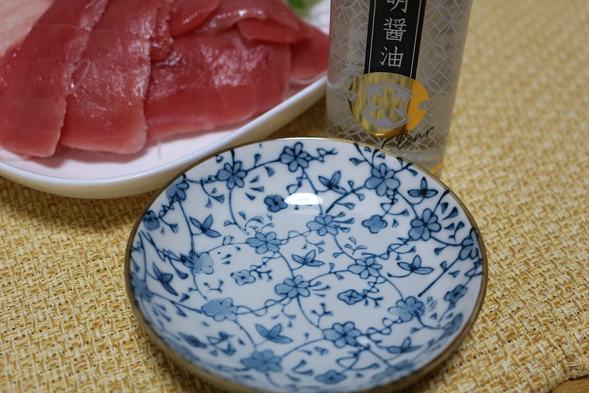 まぐろの刺身に「透明醤油」をつけてみまた。 一般的なしょうゆの甘辛さがなく、とってもまろやかで美味しいです。