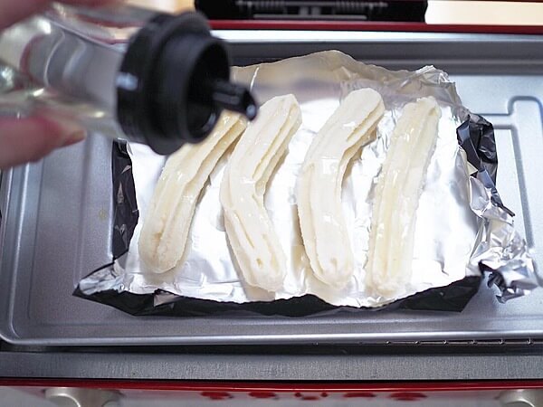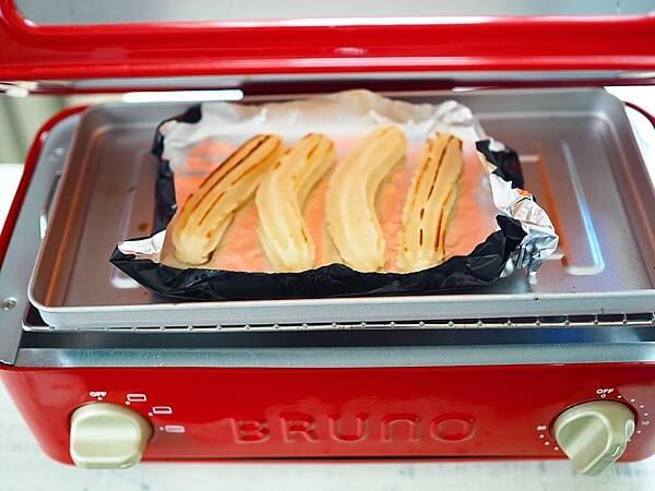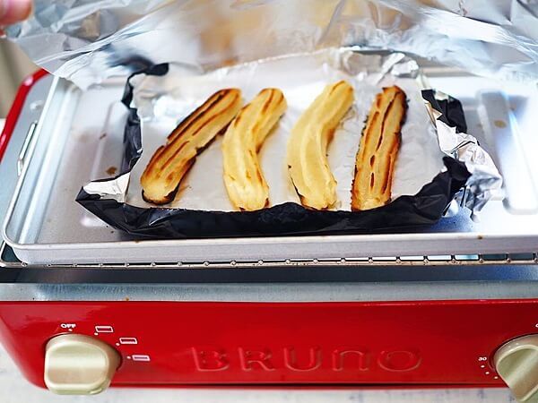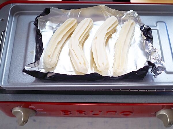 まず、オーブントースターにホイルを敷き、冷凍庫から出したばかりのチュロスを4本並べます。
