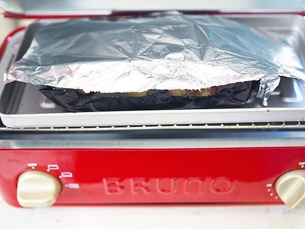1050wで5分経過した頃から少し焼き目が付いてくるので、焦げないようにアルミホイルをかぶせて蓋をします。