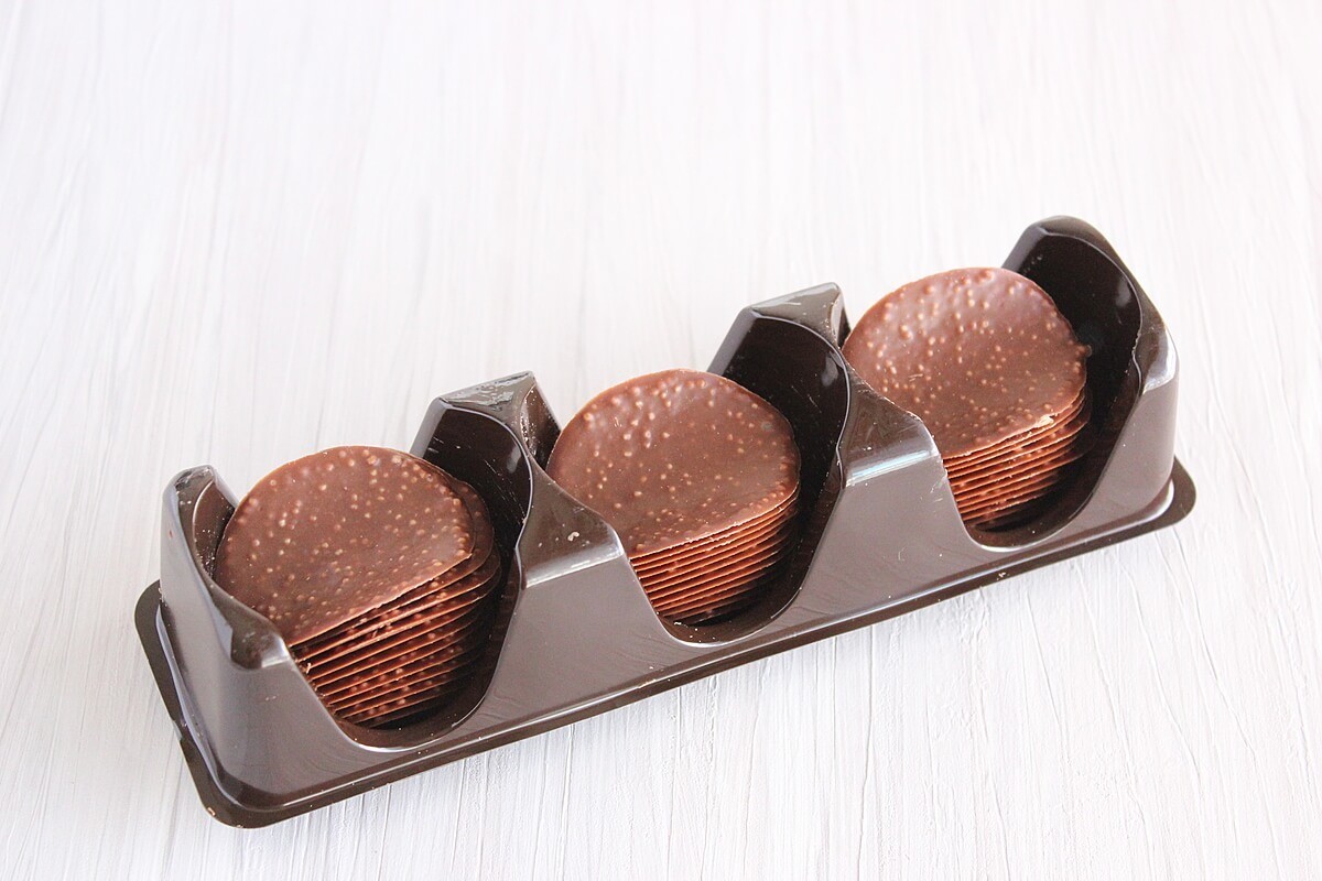 ヤマザキナビスコのチップスターのような形状で薄く、美しく整ったチョコレートが並んで入っています。