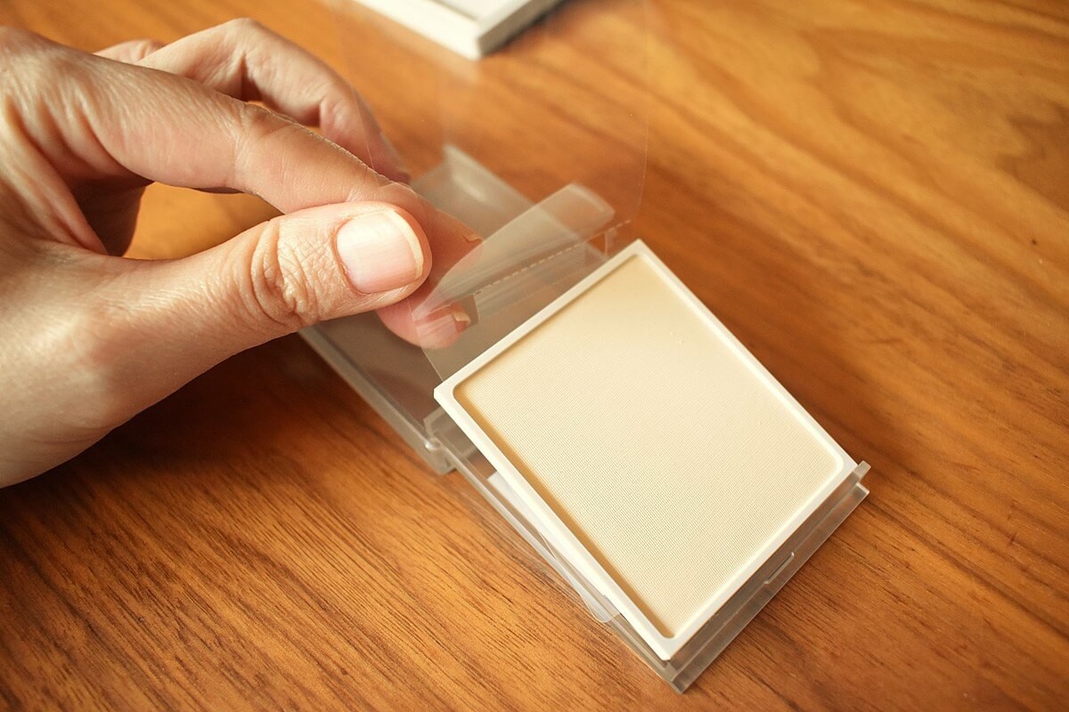 ケースを開けると「透明シート」がビロンとかぶさっているので、こちらをひっぱりあげれば、ご覧のとおりルースパウダー本体が宙に浮きます。