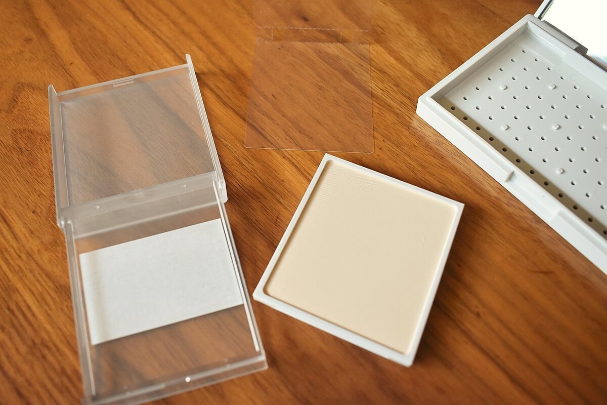 「普通の両面テープではりつけているけれどはがれやすい」という場合は、無印良品で別売りしている「メイクパレット用両面テープ1シート(5枚入)」での貼り付けがおすすめ。