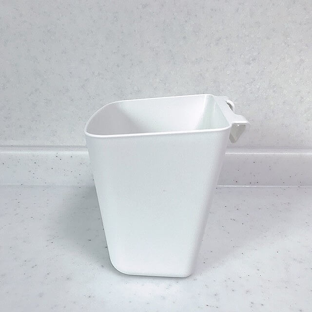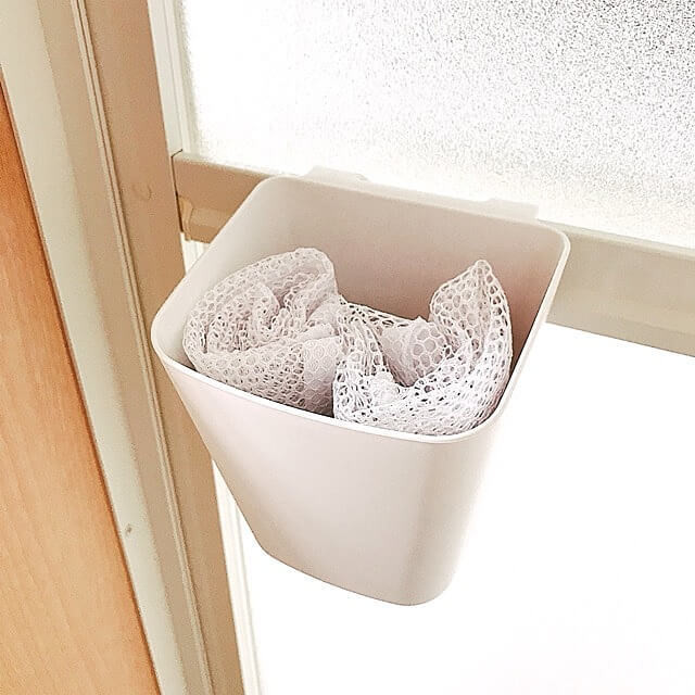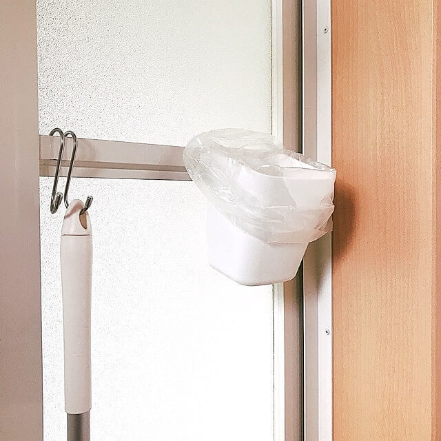わが家では、お風呂のドアにあるバーに引っ掛けて、洗面所のごみ箱として使っています。