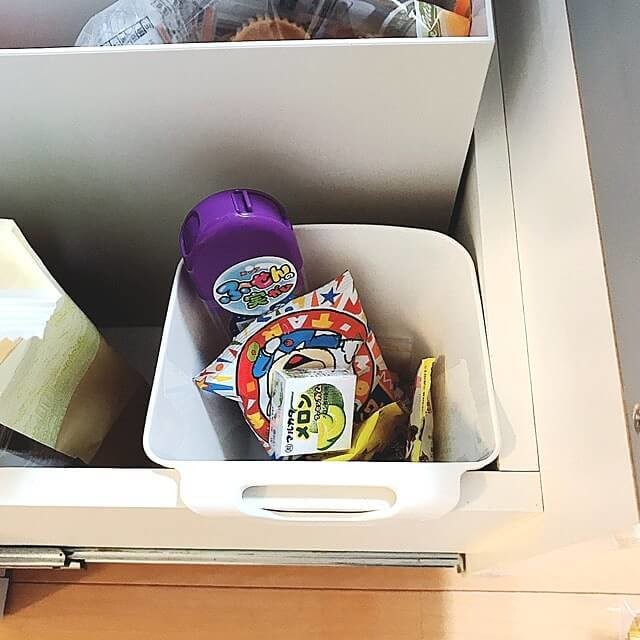 わが家では、子どもの駄菓子が埋もれないよう、小さなお菓子はこの小物入れに入れるようにしています。