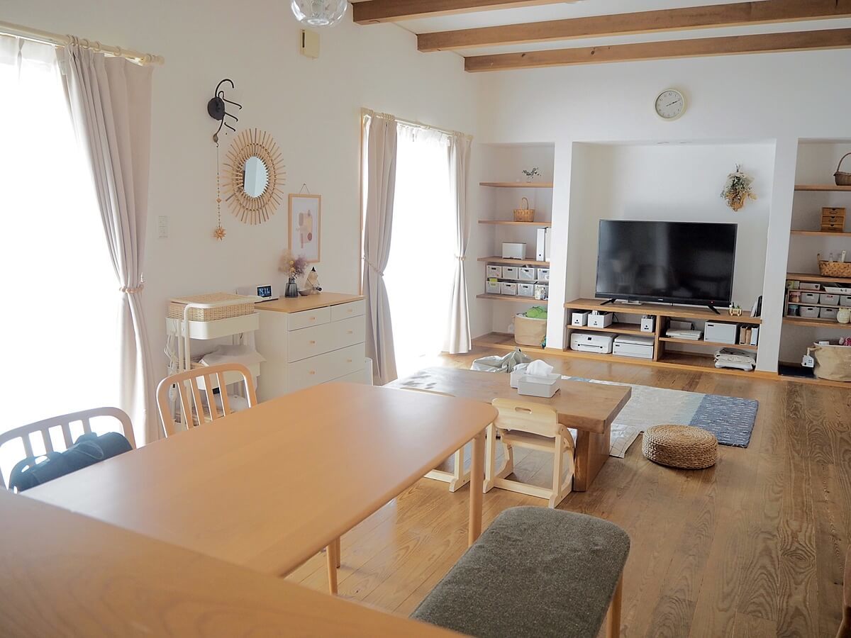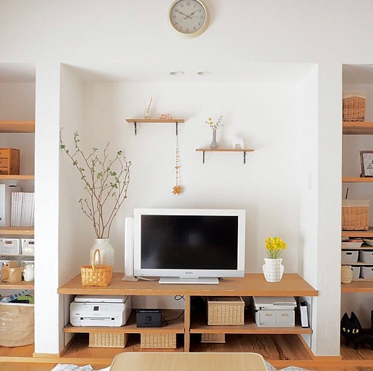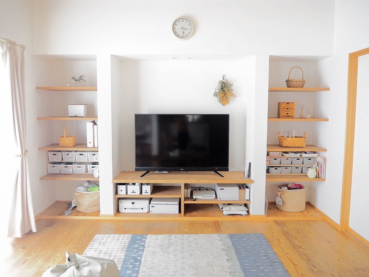 テレビが黒くて大きい分、周りの収納グッズを明るい色味にしましたが、見た目だけでなく使い勝手も良くすることが出来たので、とても満足しています◎。