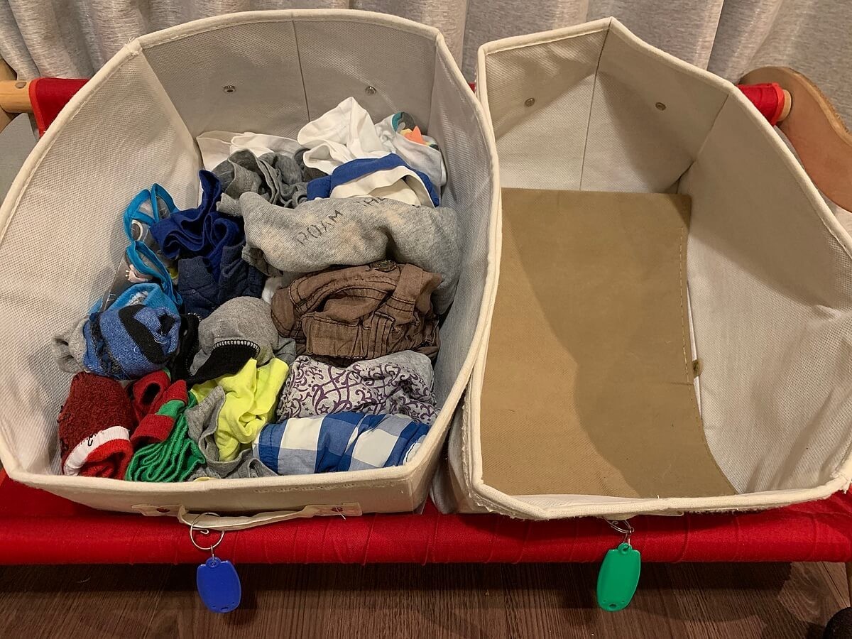 ▲こちらが、長男と次男の洗濯物の仮置き場です。長男のボックスは空です!優秀!