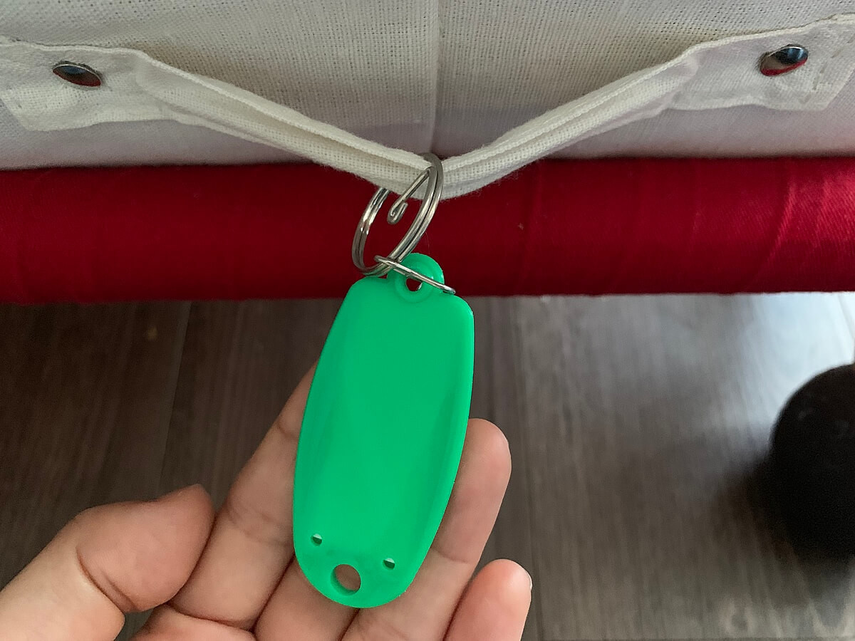そこで、思い切って側面に穴をあけ、結束バンドでラベルを取り付けました。手で出来るラミネートカードは、セリアで購入したものです。