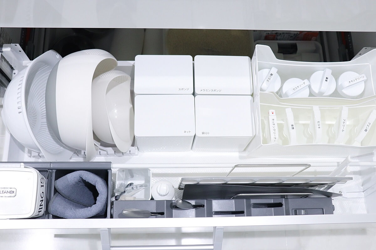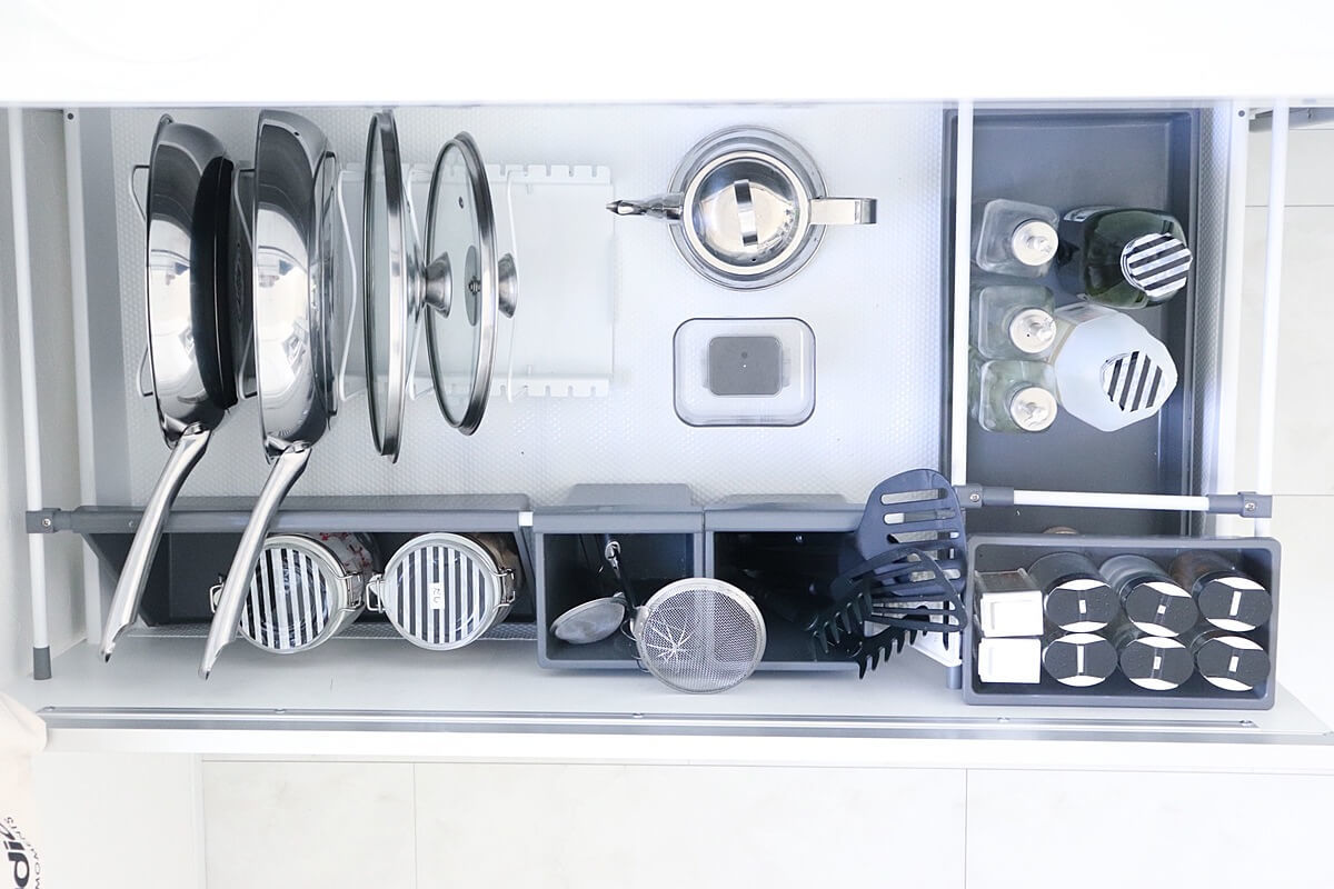 引き出しの場合は上から見て、開き戸の場合は正面から見て、どこに何があるかすぐに分かるようにすることで、物の出し入れがスムーズになり、時短に繋がります。