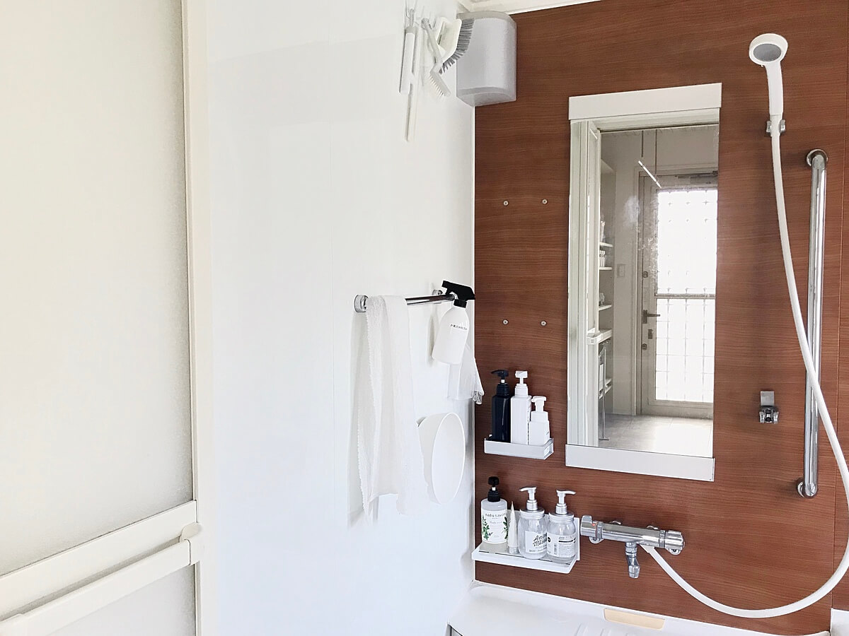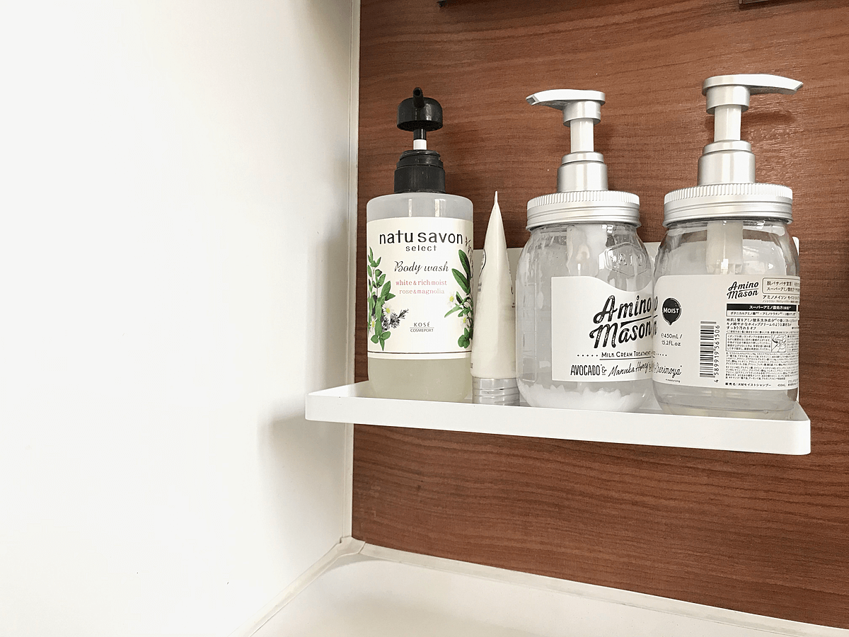 お風呂場には備え付けの棚が3段ありましたが、上段と中段は高さがありすぎて風呂椅子に座りながら目的のものを取るのが困難でした。