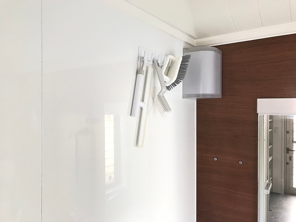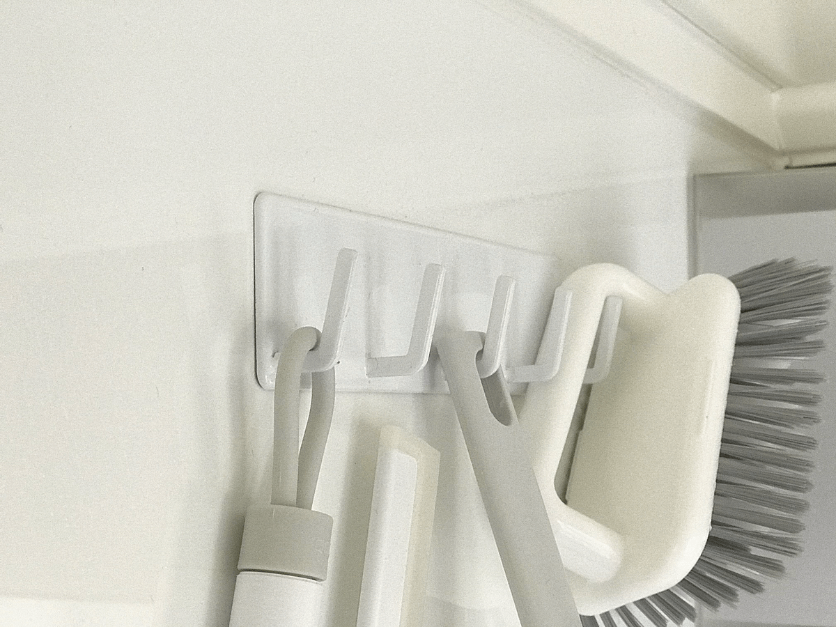 そこで気付いた時にすぐ掃除できるよう、お風呂場の中に掃除道具を置いておけないかと思い、取り入れたのが、この5連マグネットフックです。