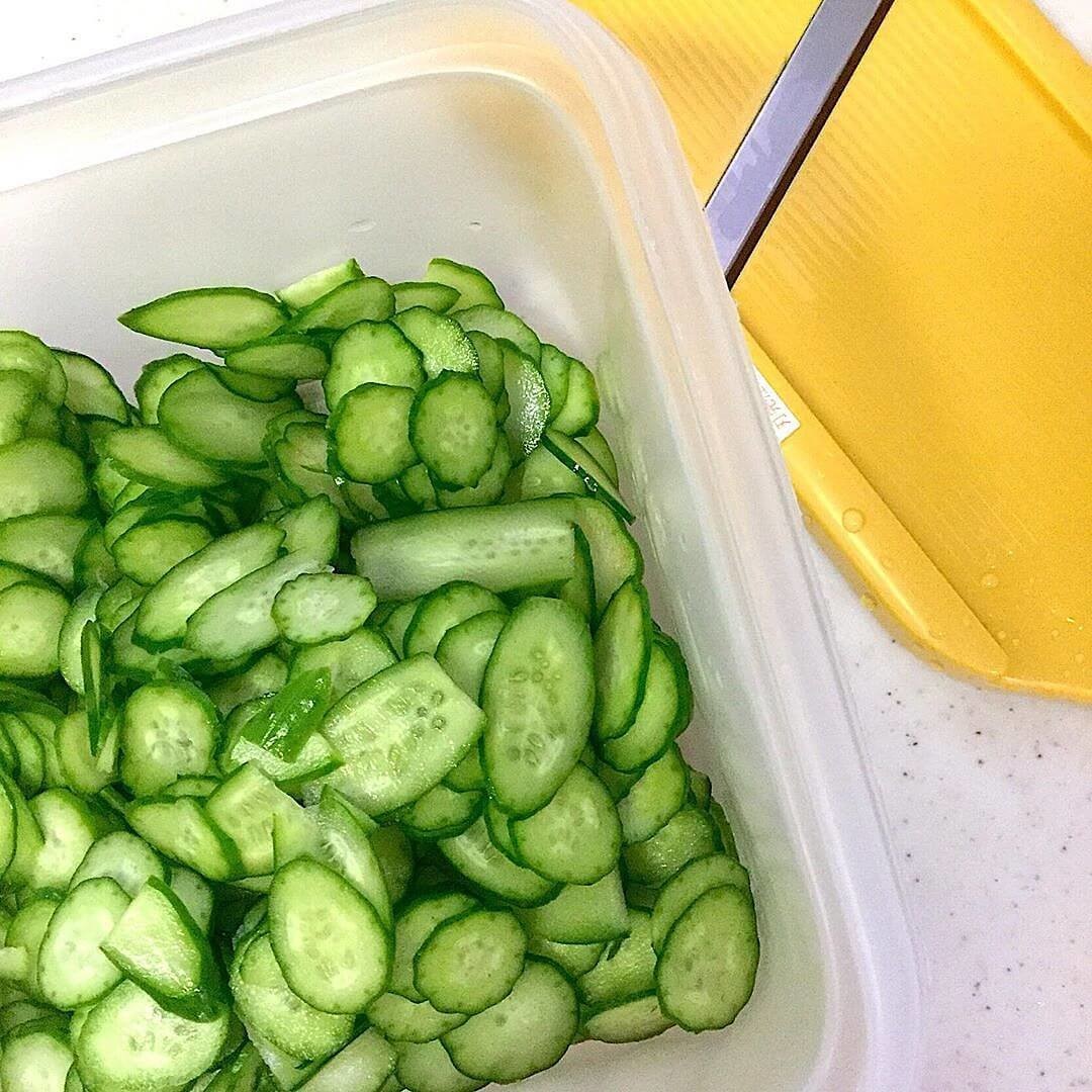 愛工業のスライサーがあれば、大量のきゅうりもあっという間にスライスできますよ。きれいで均一に仕上がるため食感が格段にアップしたそうです!