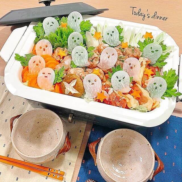 @pipi.kapi_cookさんがハロウィンに作った、おばけ鴨つくね南蛮鍋がこちら!表情豊かなおばけが可愛すぎます♡