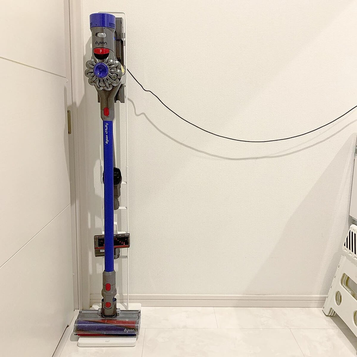 すき間を有効活用したことで、もともとあったカラーボックスの場所にコードレスクリーナースタンドを置いて充電スペースに。