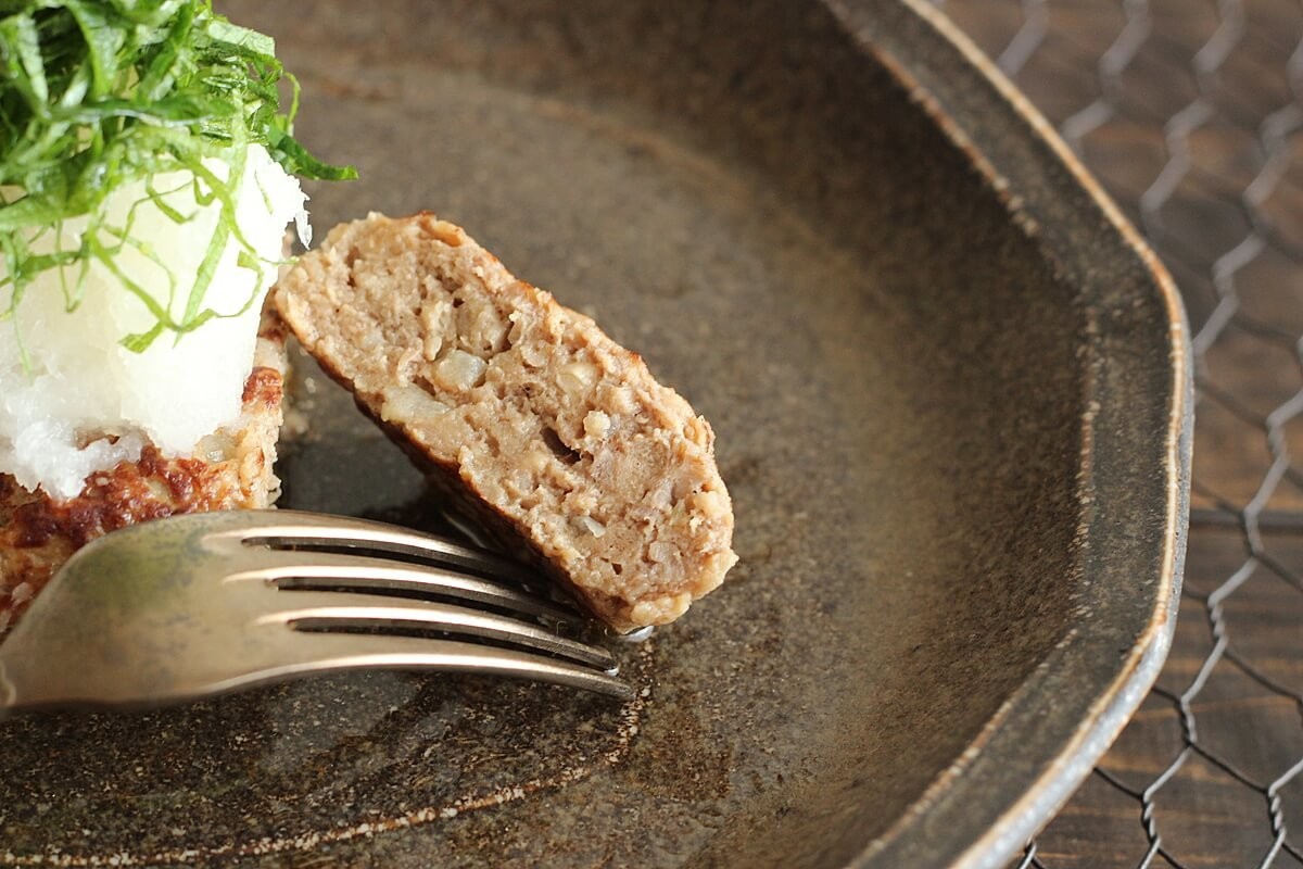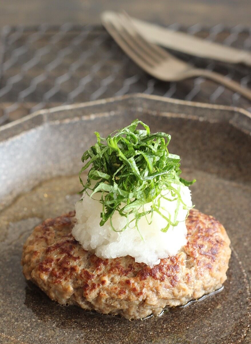 蒸し器で蒸したハンバーグに、たっぷりの大根おろしとシソ、ポン酢をかけていただきます。
