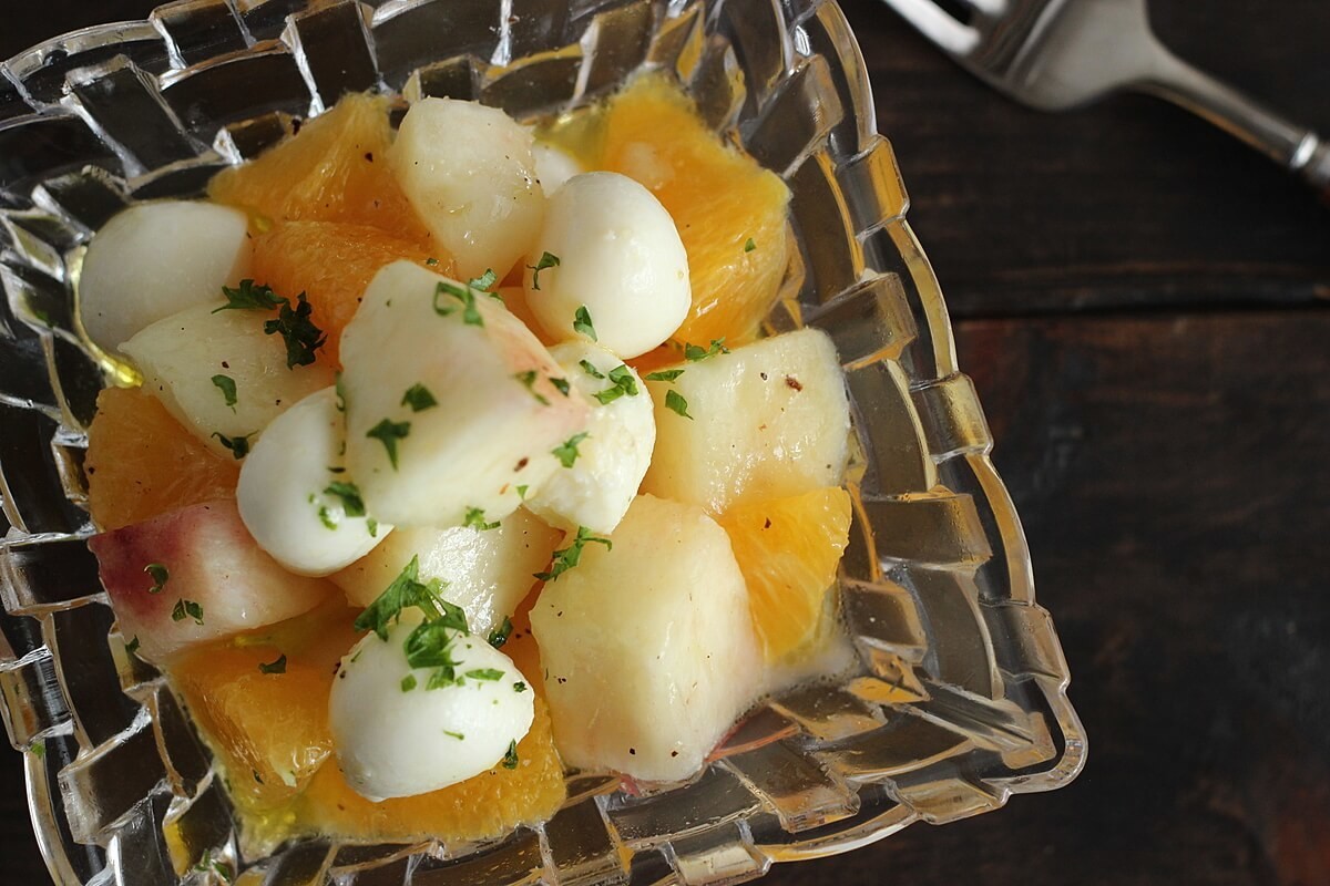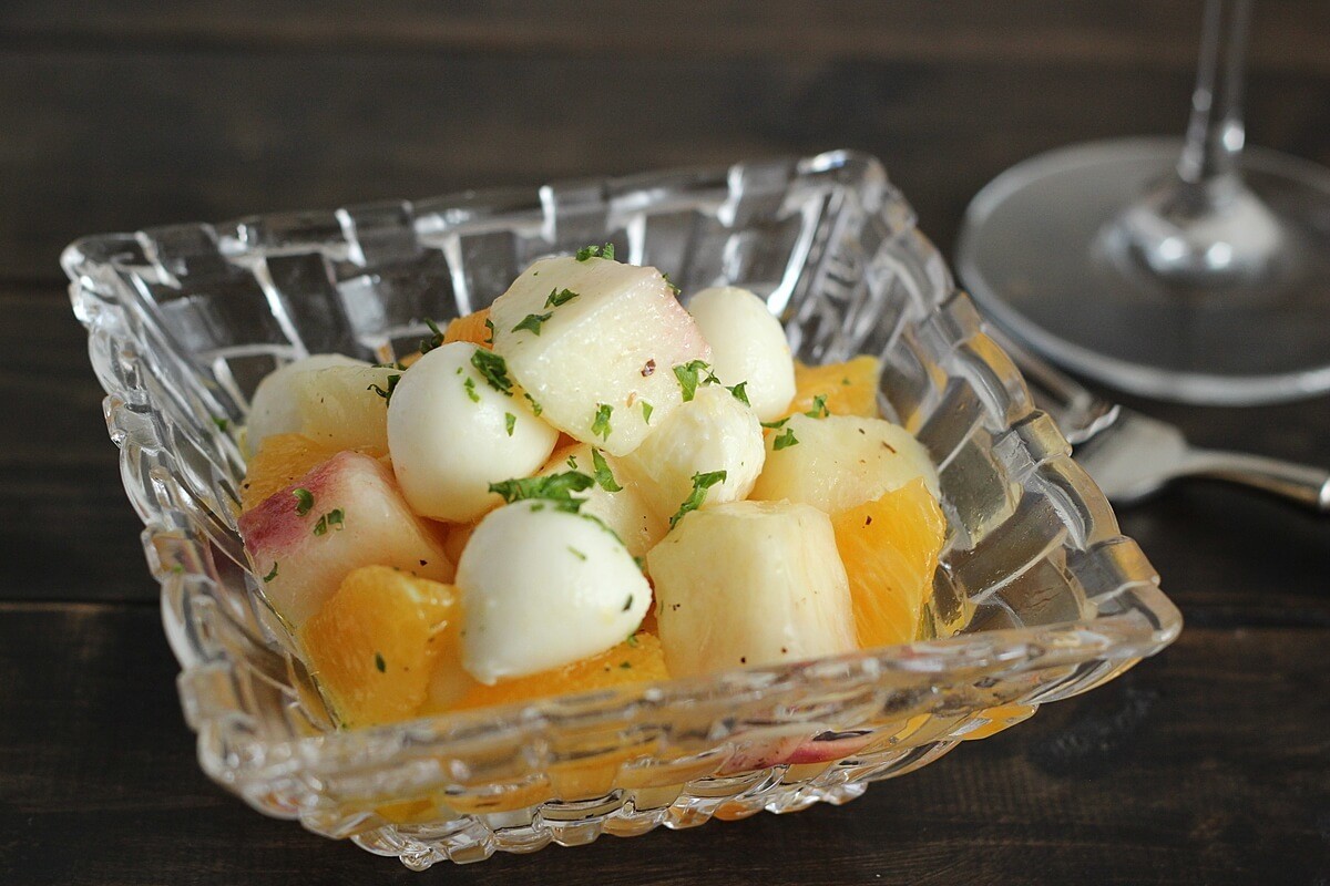一口大に切った桃とオレンジ、解凍したモッツァレラチーズを、オリーブオイル、ホワイトビネガー、塩、こしょう、レモン汁であえました。