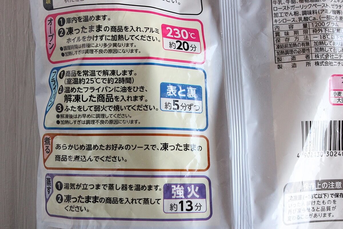 食べ方は、 ①オーブンで温める②解凍してからフライパンで焼く③ソースに入れる④蒸す、のいずれかの方法でと、パッケージにあります。