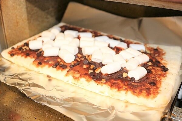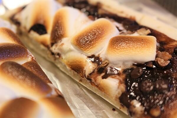 ベルギー産クーベルチュールミルクチョコをふんだんに使用したソースと、チョコチップとピーカンナッツ、マシュマロがトッピングされた子どもウケ抜群のピザは、予想通り甘い!