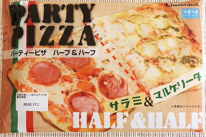 今回紹介するのは「パーティーピザ ハーフ&ハーフサラミ&マルゲリータ」ですが、子ども受けしそうな「パーティーピザ ハーフ&ハーフ照り焼きチキン&ツナコーン」もあります。