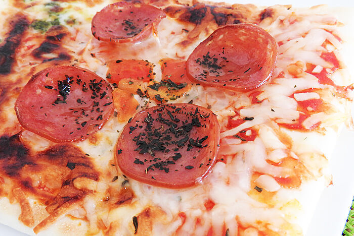 トマトペーストとチーズ、たっぷりのサラミソーセージがのったピザ。シンプルながらも、万人受けしやすいサラミのピザは1枚なんと190円(税別)!