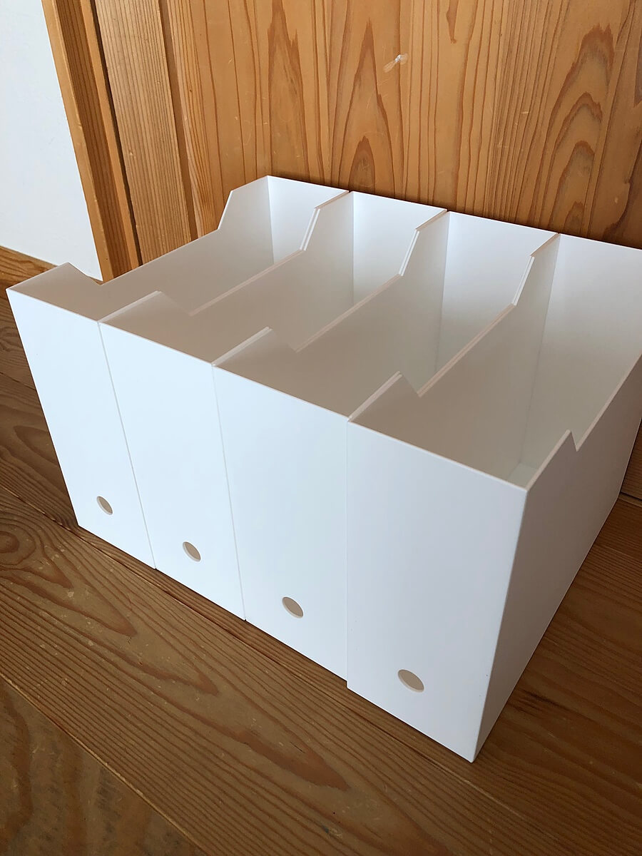 ニトリ「A4ファイルケース オールホワイト」は収納したい場所のサイズにぴったり。100均よりも高いですが、同一商品が無くなる可能性を考えると、ニトリならそう簡単に廃盤にならないだろうという考察からです(無印良品をここで使うのは勿体ない)。