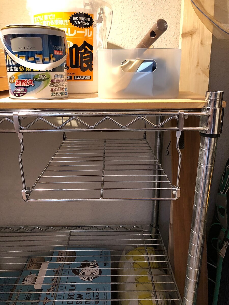 このようにスチールラックの上部から吊るして物を置く空間を作り出すことができる便利グッズなのです。