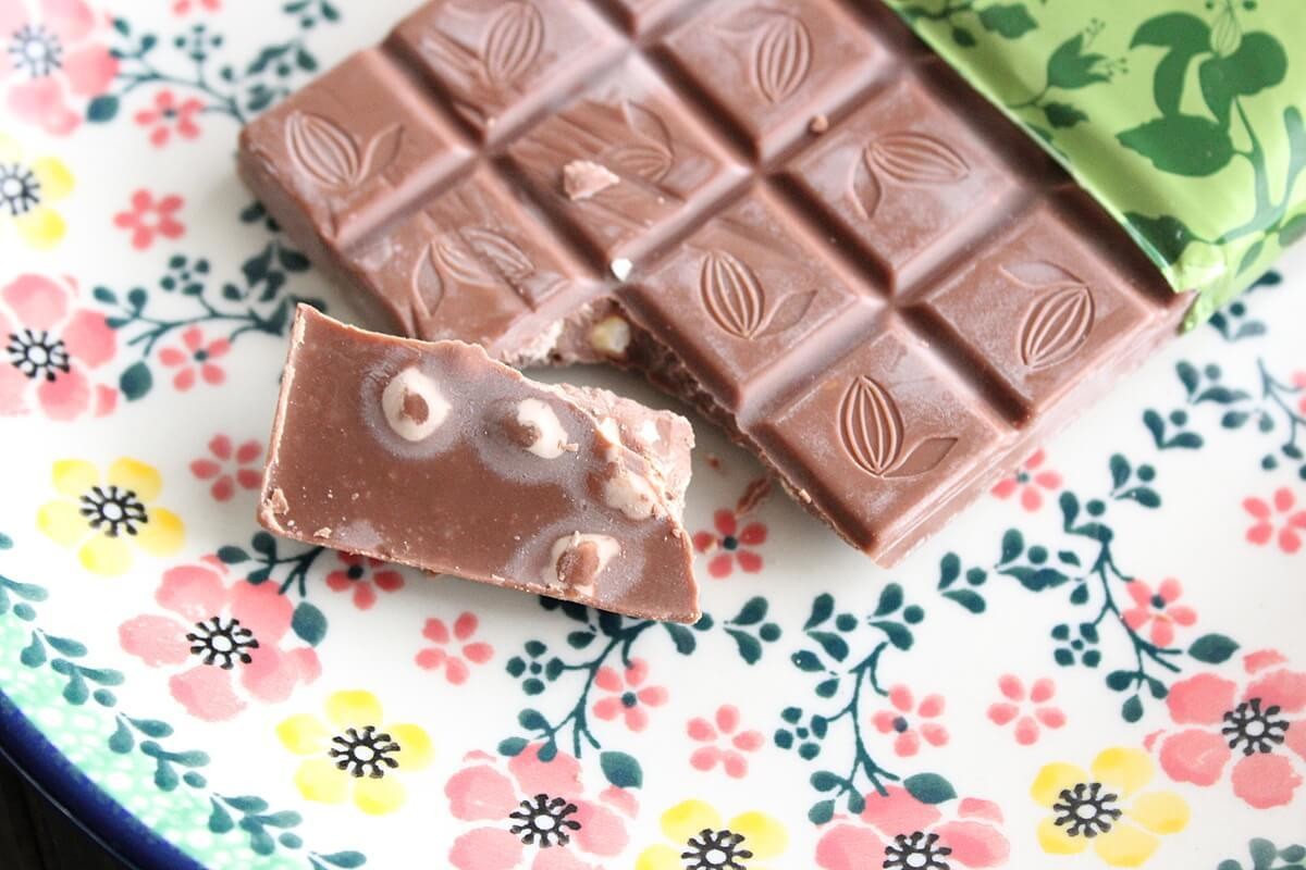 ヘーゼルナッツ入りミルクチョコレートは、ヘーゼルナッツの歯ごたえと、ミルクチョコレートの相性が良く、止まらなくなる危険な美味しさです。