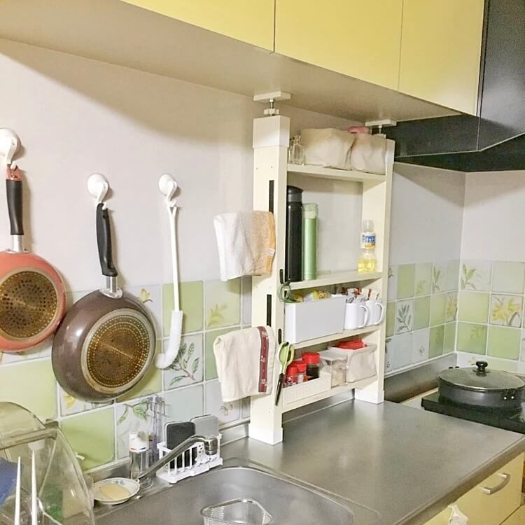 ラブリコという上下を突っ張る機具を使用して、キッチンの上に棚を作りました。