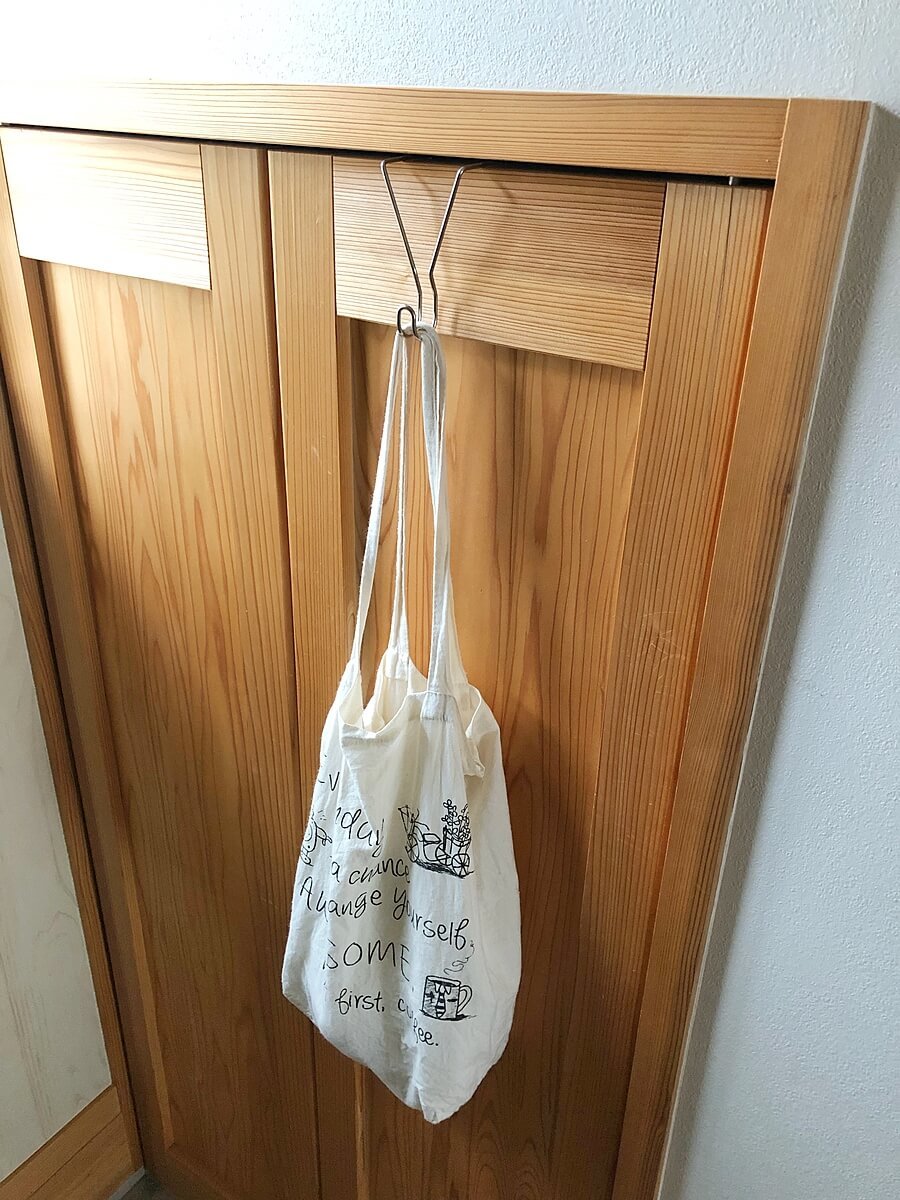 過去にこの土間収納の扉にこのようなバッグ用のフックを取り付けようとしたことがあるのですが、意外と扉の厚みがあって購入したフックのサイズが合わず泣く泣く返品した過去が。