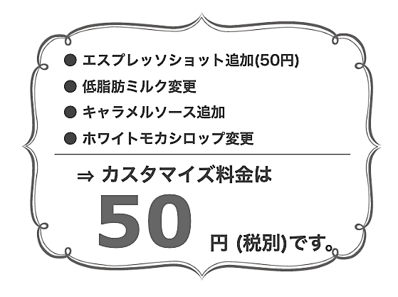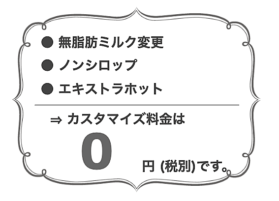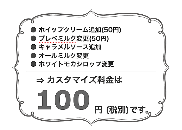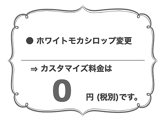 ホワイトモカはホワイトチョコレートで作られたシロップなので、とても甘くなってしまうように感じてしまうかもしれません。ですが、実際に飲んでみるとほんのりと甘さを感じられる程度。また、こちらのカスタマイズドリンクは、シロップを変更しただけなのでカスタマイズ料金はかかりません。