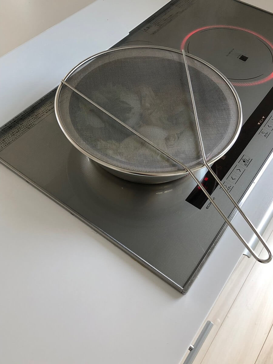 油ハネしやすい料理や、トマトソースの調理時は便利な網タイプの油ハネガードを使用しています。