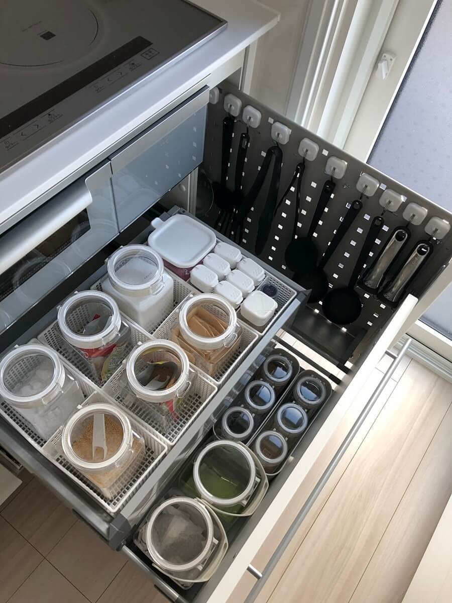 調理中にすぐ使えるようIHの下には調味料類、横には調理器具を収納しています。