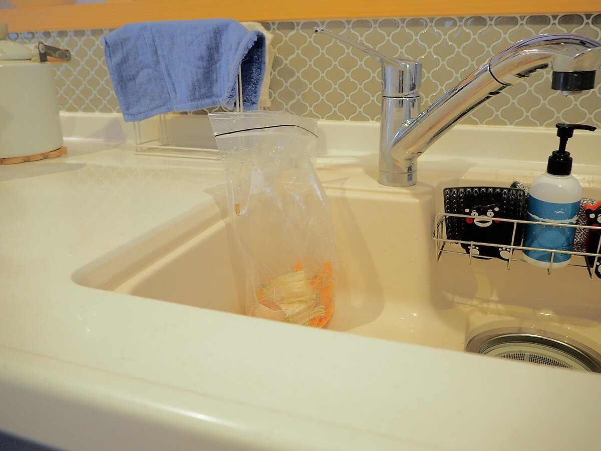 解凍したお肉を取り出した後、保存袋は野菜くず入れとして使用しています。