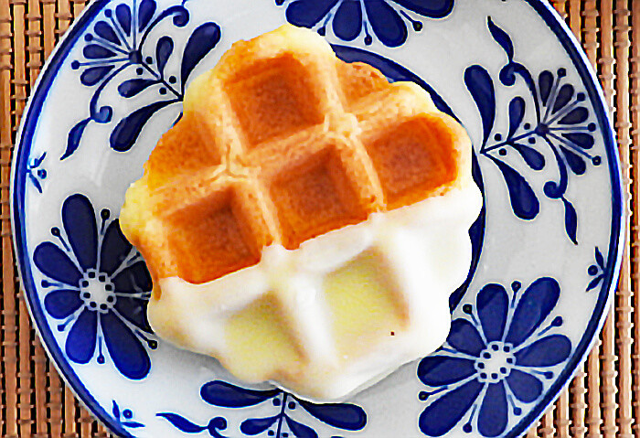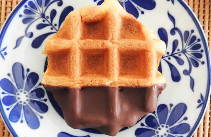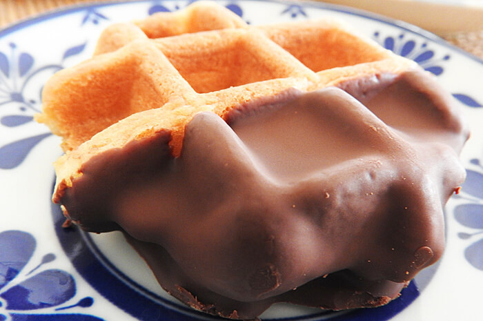 ビスキュイ生地と呼ばれる、卵白と卵黄を別々に泡立てて作った生地にスイートチョコがかかったワッフル。私はこのワッフルが一番のお気に入りです。大きさは一般的なワッフルとは変わらず、手の平に収まる程度です。