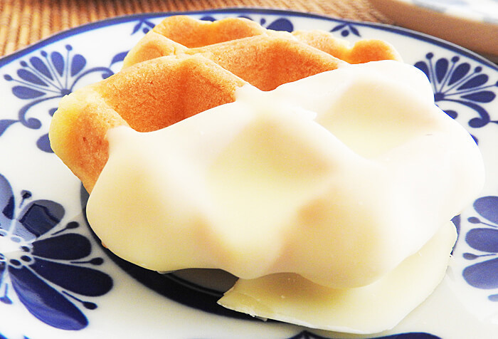 ビスキュイ生地のワッフルに、ホワイトチョコレートがかかっているワッフル。前述している「ティータイムブレッド ビスキュイワッフル スイート」と同じく、表面がさくっと中身はしっとりとしているのが特徴です。