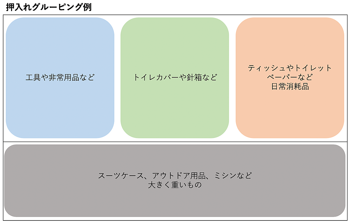 押入れをカテゴリー別にグループ分けすると、様々なことが分かりやすくなります。モノがどこにあるのか、どこにしまえばいいか、何を買えばいいか、何を処分したらいいかといったことです。