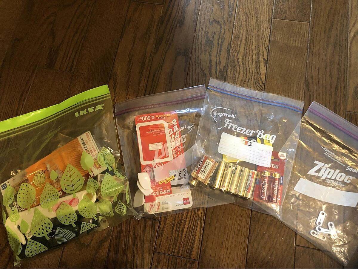 工具や何かに使ったフックなどのような、細々したアイテムは、ジップロックに入れてから収納すると、中身が見えてわかりやすくなるのでおすすめです。