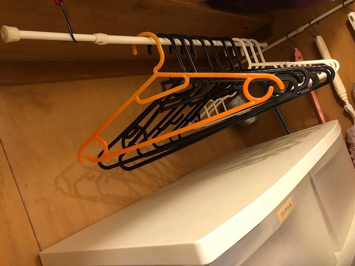 こちらの写真は、引き出しの上のスペースを活用するために、押入れの天井にハテナフックを取り付け、S字フックをかけてから突っ張り棒を吊るした例です。そこに収納場所に困りがちなハンガーを掛けています。