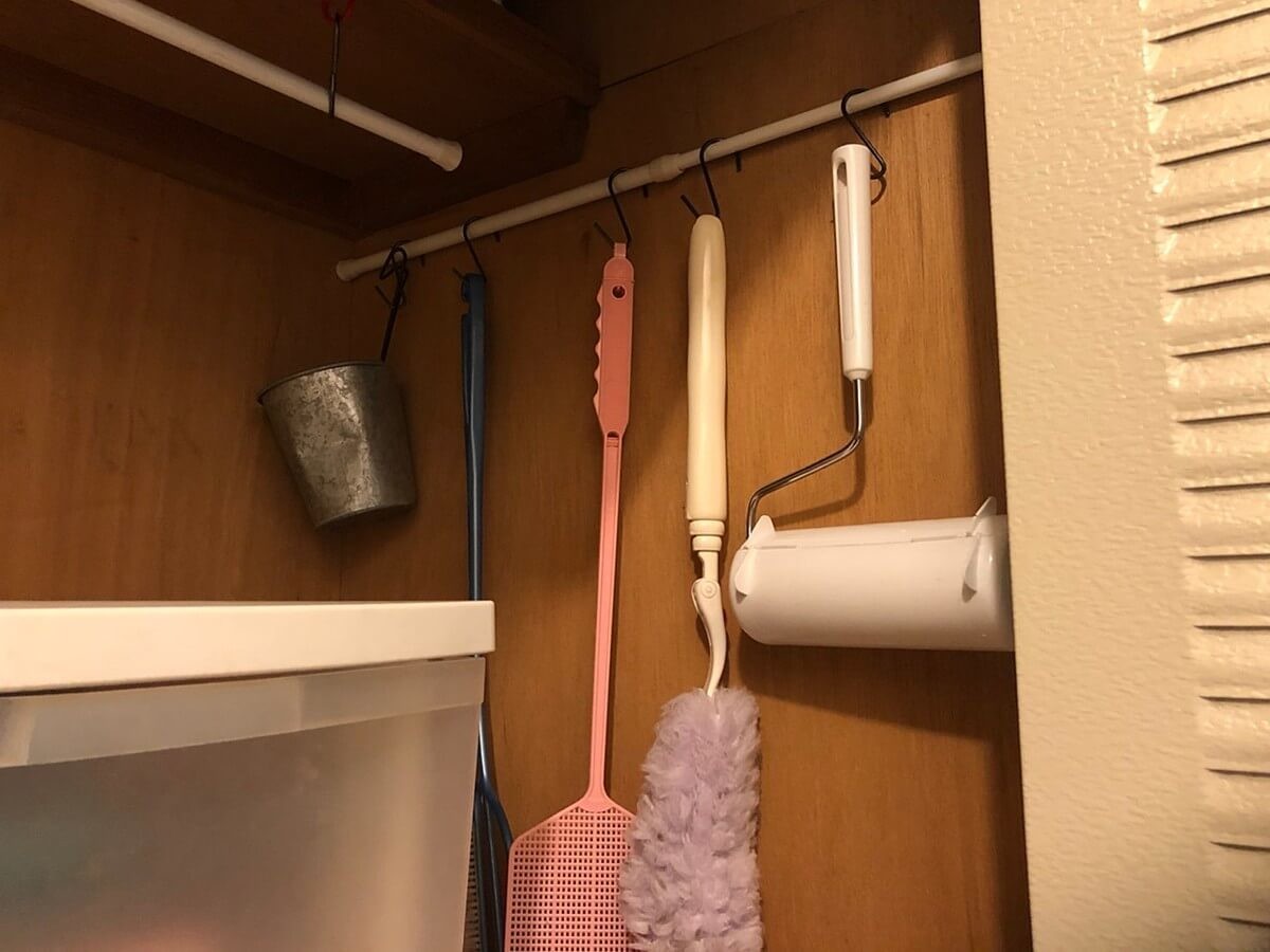 こちらの例は、サイドのデッドスペースを活用するために、突っ張り棒を渡したものです。サイドの突っ張り棒にはバラバラしがちな掃除アイテムをかけています。