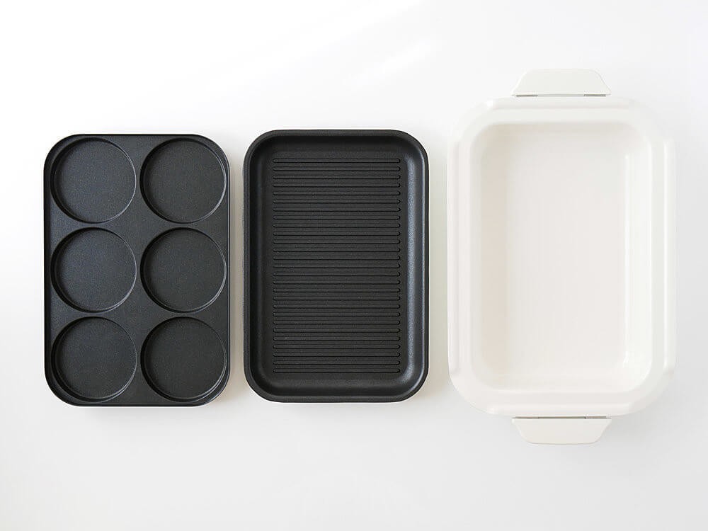 ブルーノコンパクトホットプレートの上にセットして幅広いメニューを楽しめるオプションプレート&鍋2種類は、朝食からしっかりディナーまでシーンに合わせて便利に使えます。