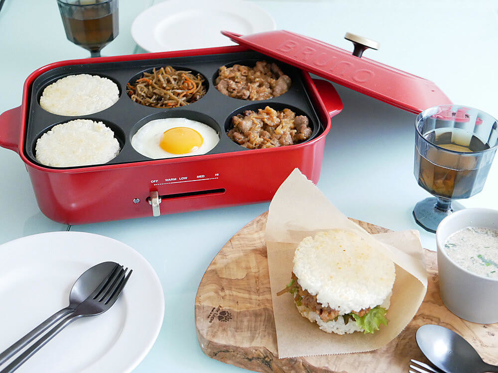 ご飯を丸く焼いてバンズ代わりに、挟む具はお好みでお肉や野菜、玉子などを残りのプレートで同時に焼けば、簡単で美味しいライスバーガーの出来上がりです。