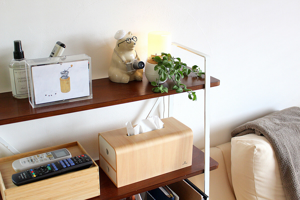 リビングの必需品ティッシュ。利用頻度が一番高いからボックスティッシュをそのままポンと置いておく方もいれば、100均などでも買えるケースに入れてインテリアに馴染ませる工夫も必要です。