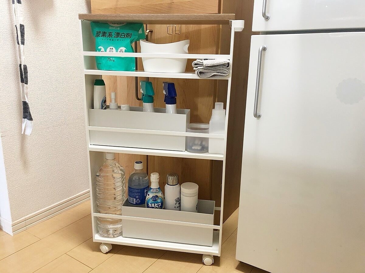 スプレータイプの掃除用具は、ワゴンの二段目にまとめて収納しているお陰で探すことがなくなりました。