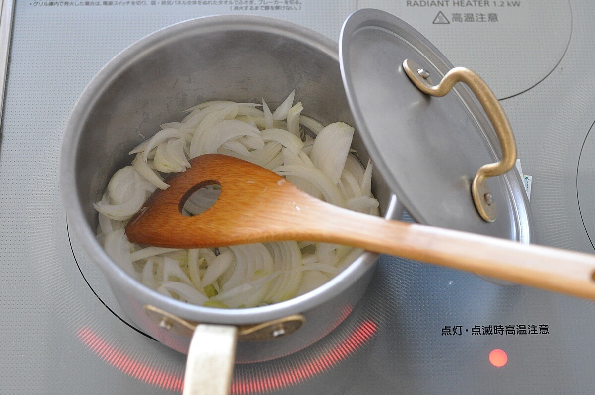 玉ねぎと長ネギが透き通ってきたら、蓋をしてごく弱火で10分間。途中5分経ったところで鍋の中を一混ぜしてまた蓋をします。