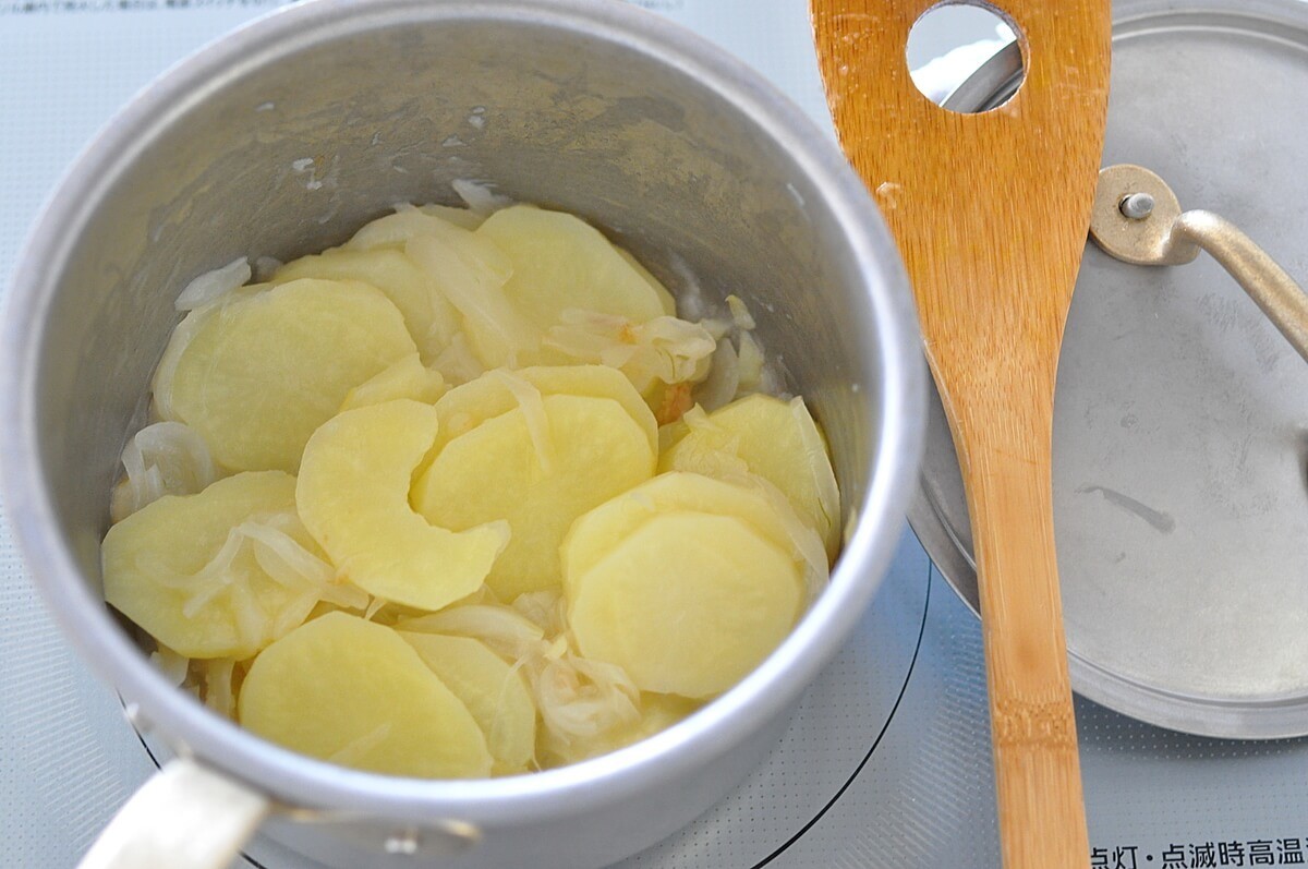 途中、焦げ付くといけないので5分経ったころに蓋を一度あけ、一混ぜします。ここでは、じゃがいもが柔らかくなるまで火を通さなくても大丈夫です。