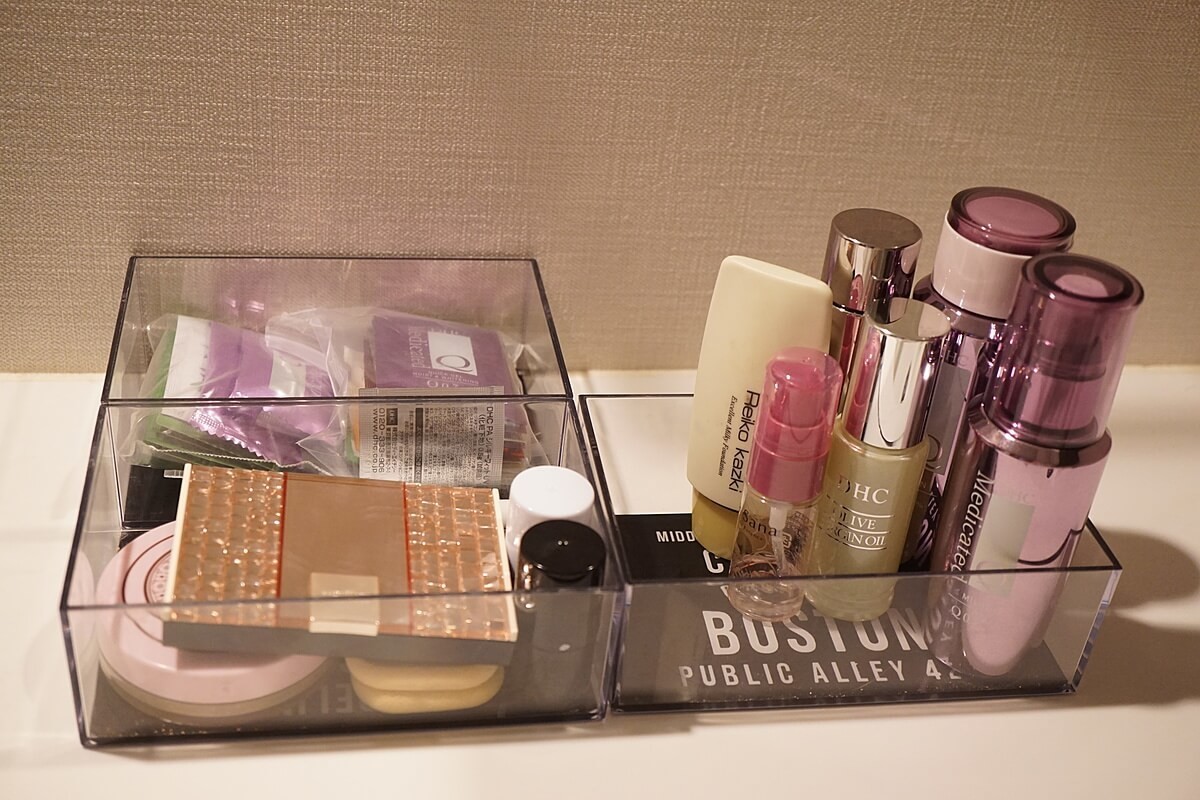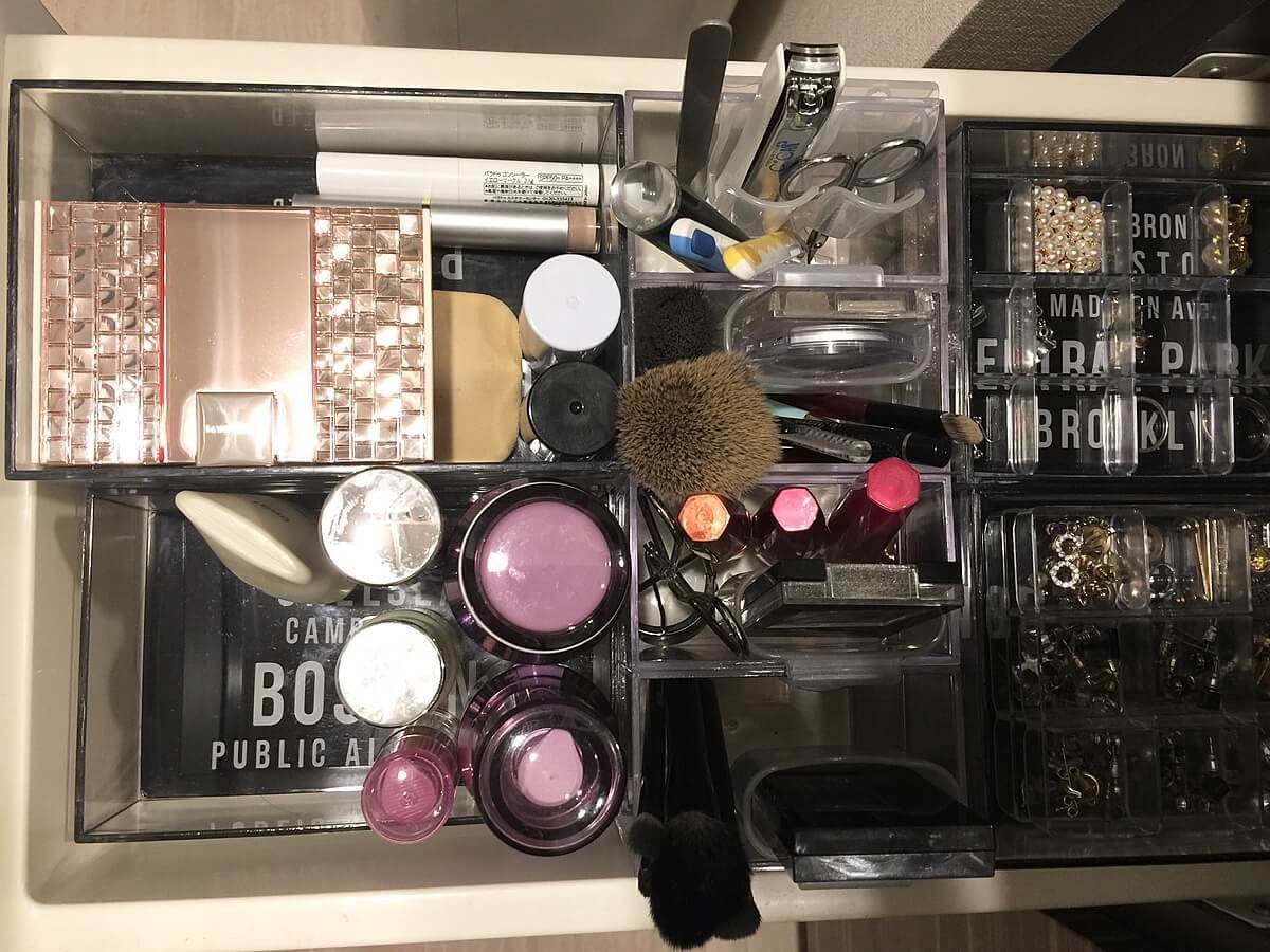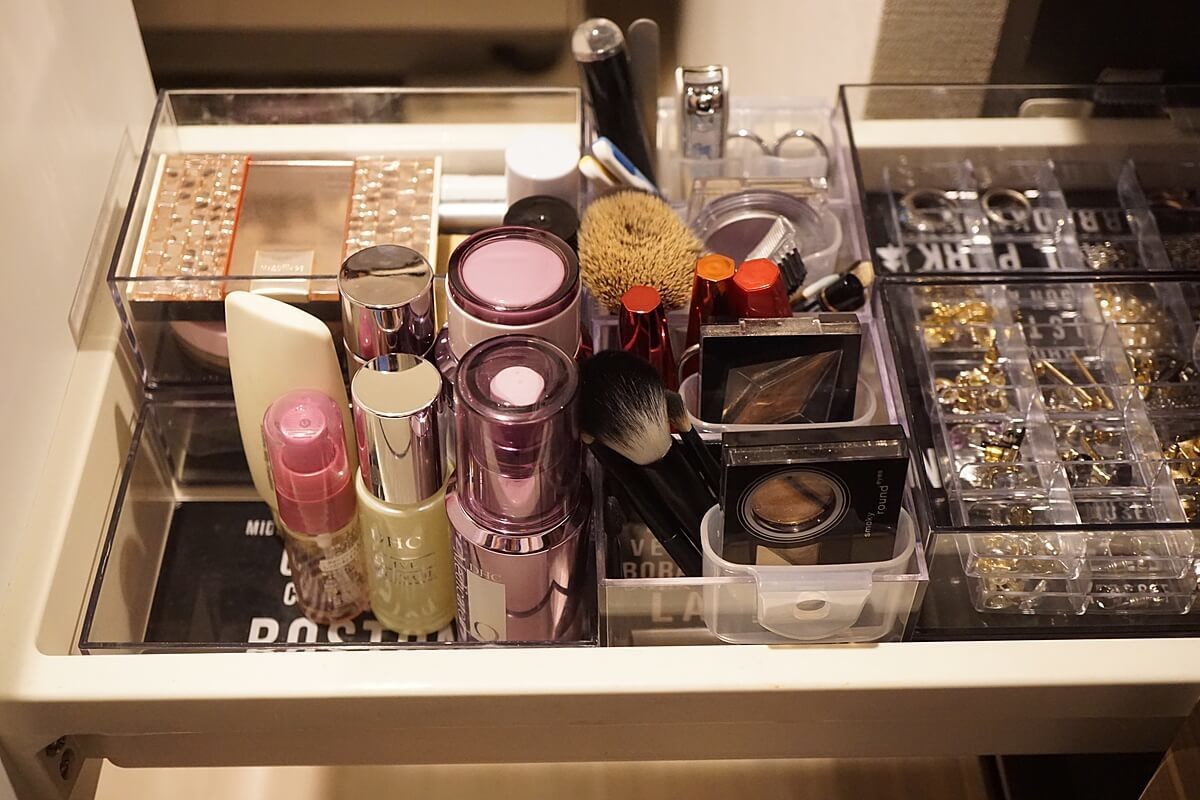 引き出し手前は下段に化粧品の試供品、上段にメイク道具を収納し2段重ねにしています。