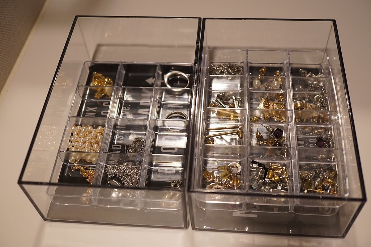 仕切りケースも100均のものを使用しています。 下段にヘアアクセサリー・上段にアクセサリーを収納し、2段重ねにしています。