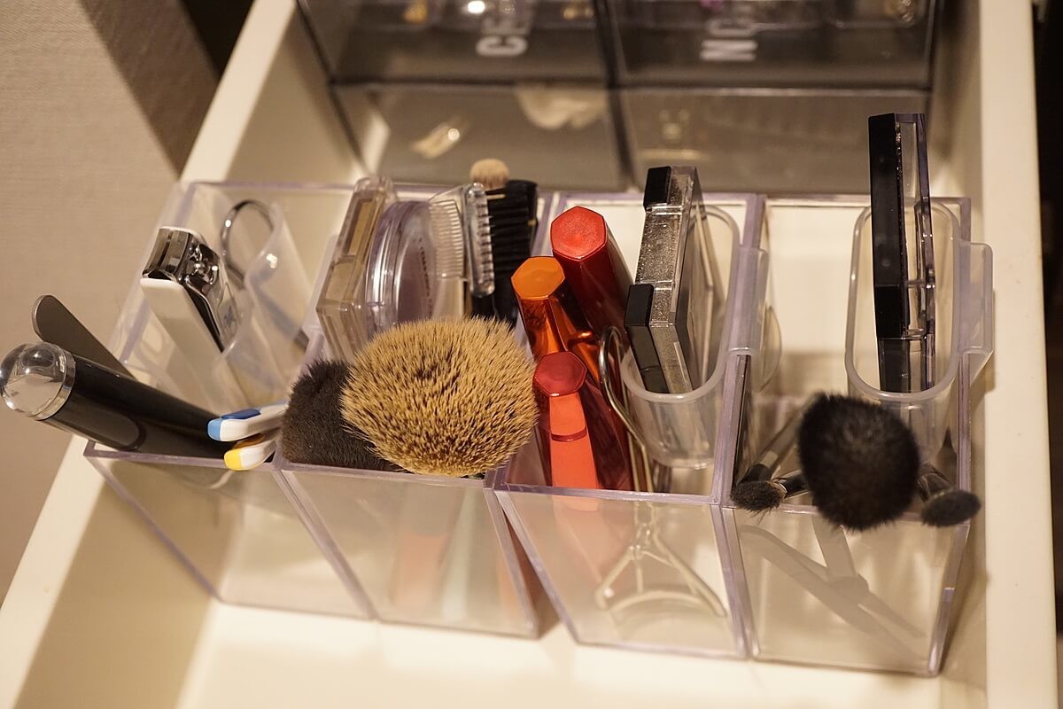 洗面台を使う時間が夫と重なってしまう場合は、必要なメイク道具だけを取り出しメイクは違う場所でします。