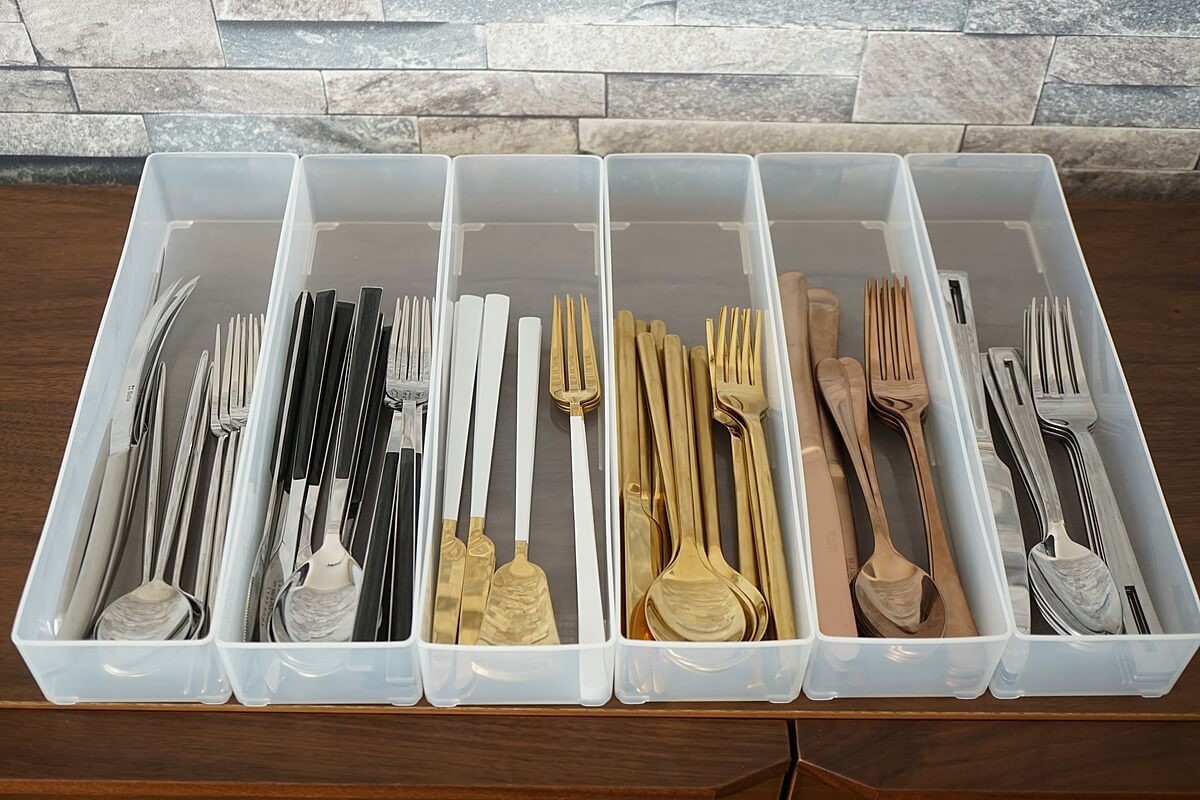 100均にはカトラリーケースも販売されていますが、サイズが小さく、フォーク・ナイフ・スプーン各4本ずつのセットは収納できませんでした。